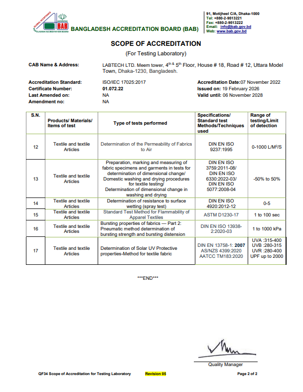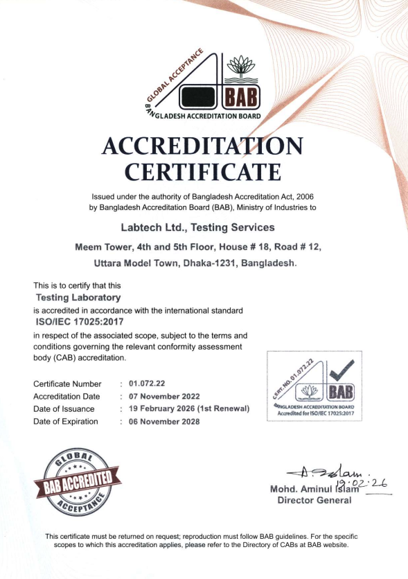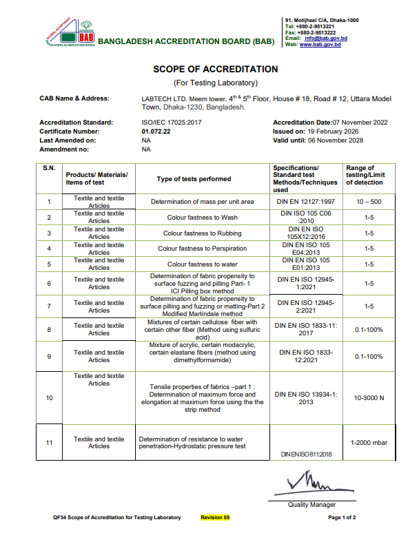 Um die Hohen Standards und den Kundenanforderungen auch im asiatischen Raum Rechnung zu tragen, ist unser Labor und Inspektionszentrum in Bangladesch durch die NABCB (National Accredtitation Board for Certification Bodies) nach ISO/IEC 17020:2012 akkreditiert.